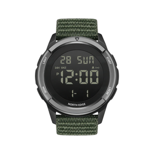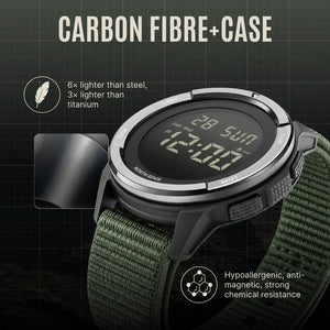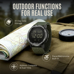 By combining a full-dial EL backlight with a high-contrast military-green display, this watch maintains flawless readability in both low-light and high-glare environments providing immediate clarity during field operations.